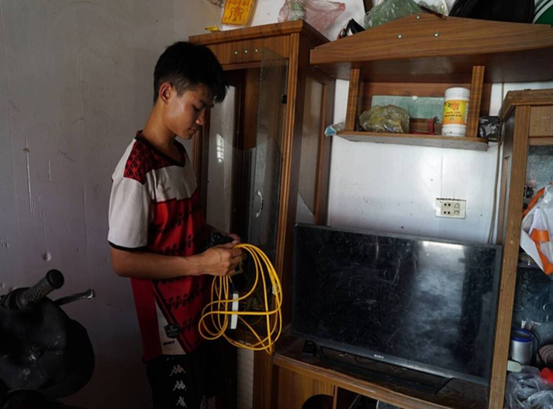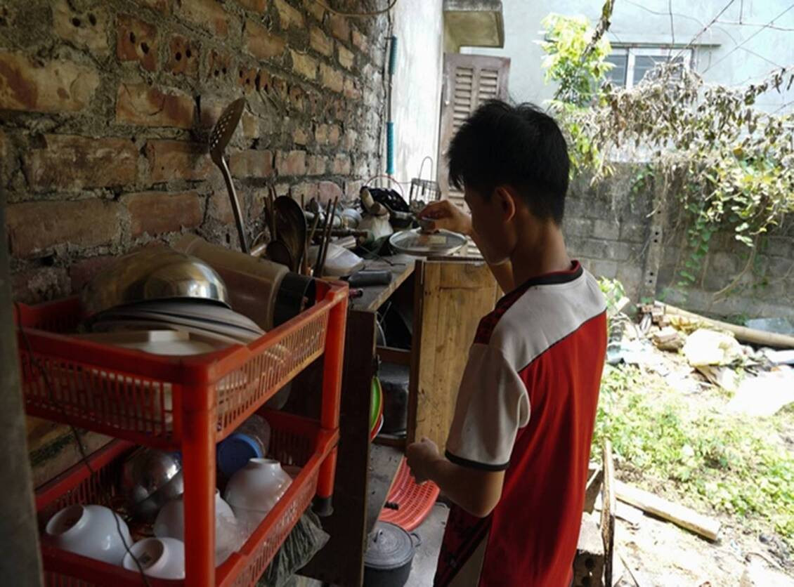 Bên trong căn nhà, tài sản đáng giá nhất có lẽ chỉ là hai chiếc xe máy đời cũ, mấy chiếc xe đạp cùng những chiếc tủ, bộ bàn ghế gỗ lâu năm đã ọp ẹp cùng vài món vật dụng cơ bản. Trong góc bếp bé xíu, nền gạch cũ, vách tường loang lổ, con trai lớn trong nhà chỉ mới học lớp 9 vẫn đang cặm cụi nấu cơm chăm các em trong khi bố mẹ vắng nhà lo chạy chữa cho bé T.A. mới gặp nạn tại Bệnh viện nhi Trung ương.