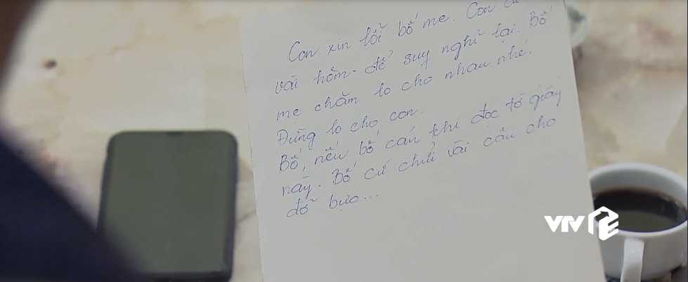 Cũng không muốn để bố mẹ lo lắng, Vũ nắn nót viết mảnh giấy để lại: "Con xin lỗi bố mẹ. Con cần vài hôm để suy nghĩ lại. Bố mẹ chăm lo cho nhau nhé. Đừng lo cho con. Bố, nếu bố cáu khi đọc tờ giấy này, bố cứ chửi vài câu cho đỡ bực."
