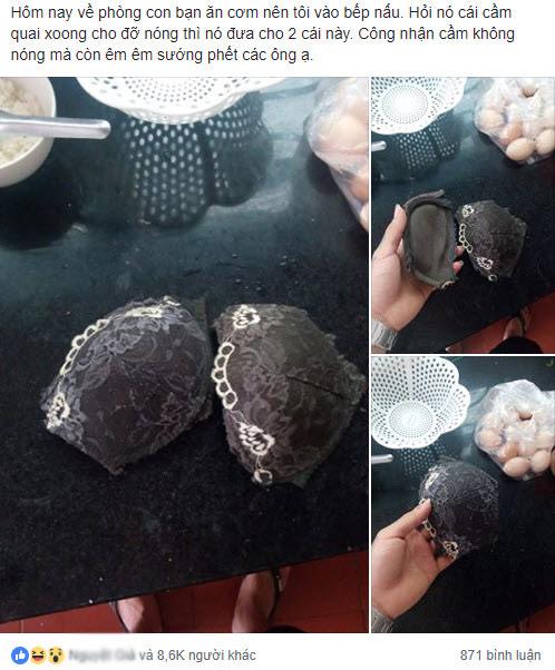 Phụ nữ quả thật là những đầu bếp cừ khôi khi tận dụng đến cả những chiếc áo ngực làm miếng nhấc nồi, một công đôi ba việc, vừa tiết kiệm, lại vừa sáng tạo. Còn với C.T, chia sẻ lại bức ảnh trên mạng xã hội chàng trai không quên nhận xét “Công nhận cầm không nóng mà còn êm êm sướng phết các ông ạ.”... khiến dân mạng cười bò.