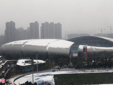 | Tuyết bắt đầu phủ dày lên SVĐ Thường Châu sáng nay. Ảnh:Tùng Lê. |