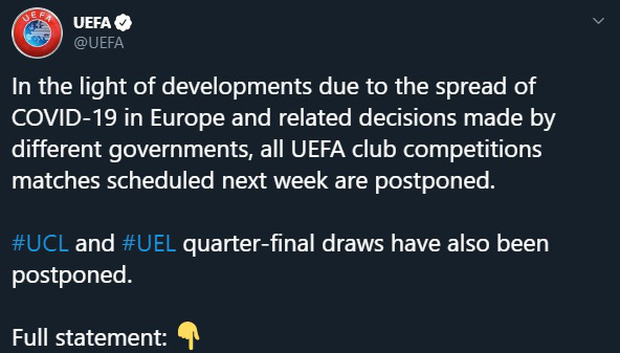 "Trong bối cảnh đại dịch COVID-19 lan rộng tại châu Âu, mọi trận đấu thuộc UEFA diễn ra vào tuần sau sẽ bị tạm hoãn. Đêm gala bốc thăm bảng đấu của Champions League và Europa League cũng chưa thể diễn ra đúng lịch trình", trích thông báo của cơ quan đầu não bóng đá châu Âu.