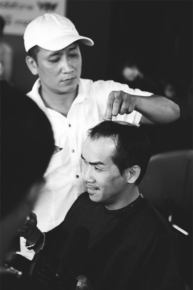 Người đăng đã viết: "Những hình ảnh lưu lại khoảnh khắc hậu trường của ca sĩ Minh Thuận "hy sinh" mái tóc thật để đóng giả NSND Trần Hiếu.