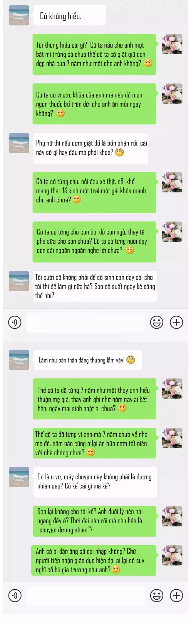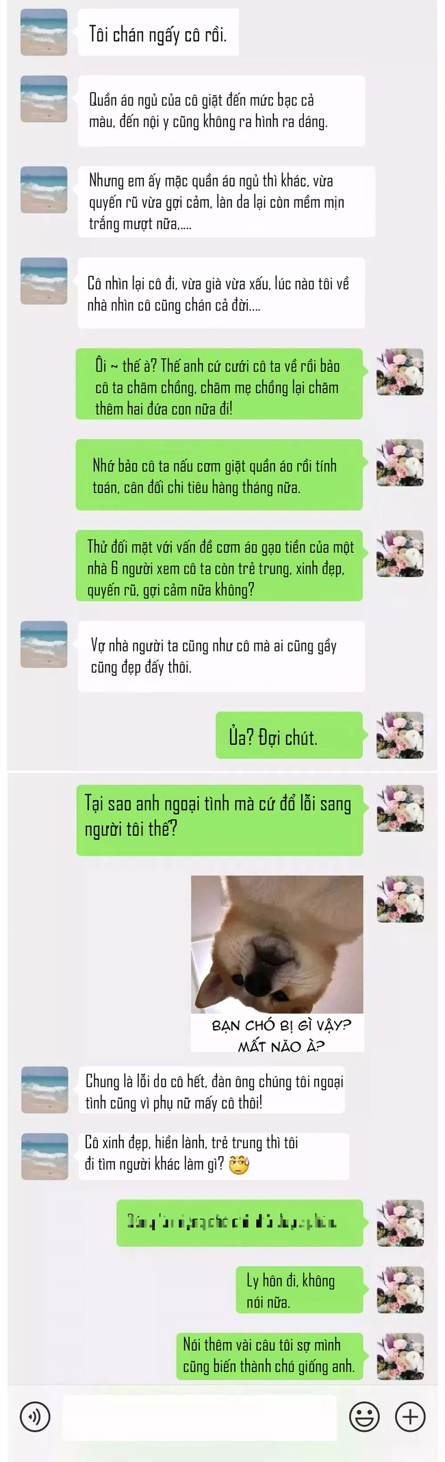 "Lúc nói đến nguyên nhân ngoại tình thì sự mặt dày của người đàn ông này khiến tôi vừa bất ngờ vừa bỡ ngỡ, nói một thôi một hồi hóa ra tất cả đều là lỗi của tôi nên anh ta mới ngoại tình à?" Chị vợ tức tối nhớ lại.