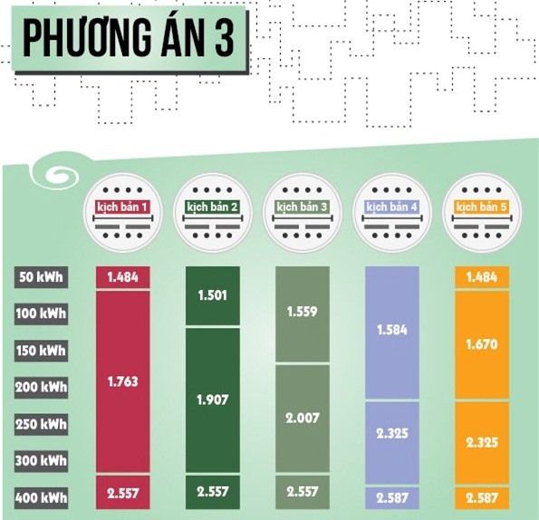 Trong khi đó, nói về phương án 3 với cách tính giá điện 3-4 bậc, GS.Trần Đình Long - Hội điện lực Việt Nam vẫn đánh giá “kém hơn nhiều về tác động điều chỉnh” so với cách tính 5 hay 6 bậc. Theo ông Long, 3 bậc mà mỗi bậc khoảng cách quá xa, chênh lệch với giá bình quân quá lớn thì vẫn thiệt hại cho người tiêu dùng. Cụ thể, khi chuyển thang giá điện xuống 3 bậc, thì người ở bậc 3 trước đây (bậc 3 trong số 6 bậc) vẫn sẽ ở bậc 3, tức bậc cao nhất. Với nhóm khách hàng này, hóa đơn điện sẽ tăng vì họ phải thanh toán giá điện cao nhất.