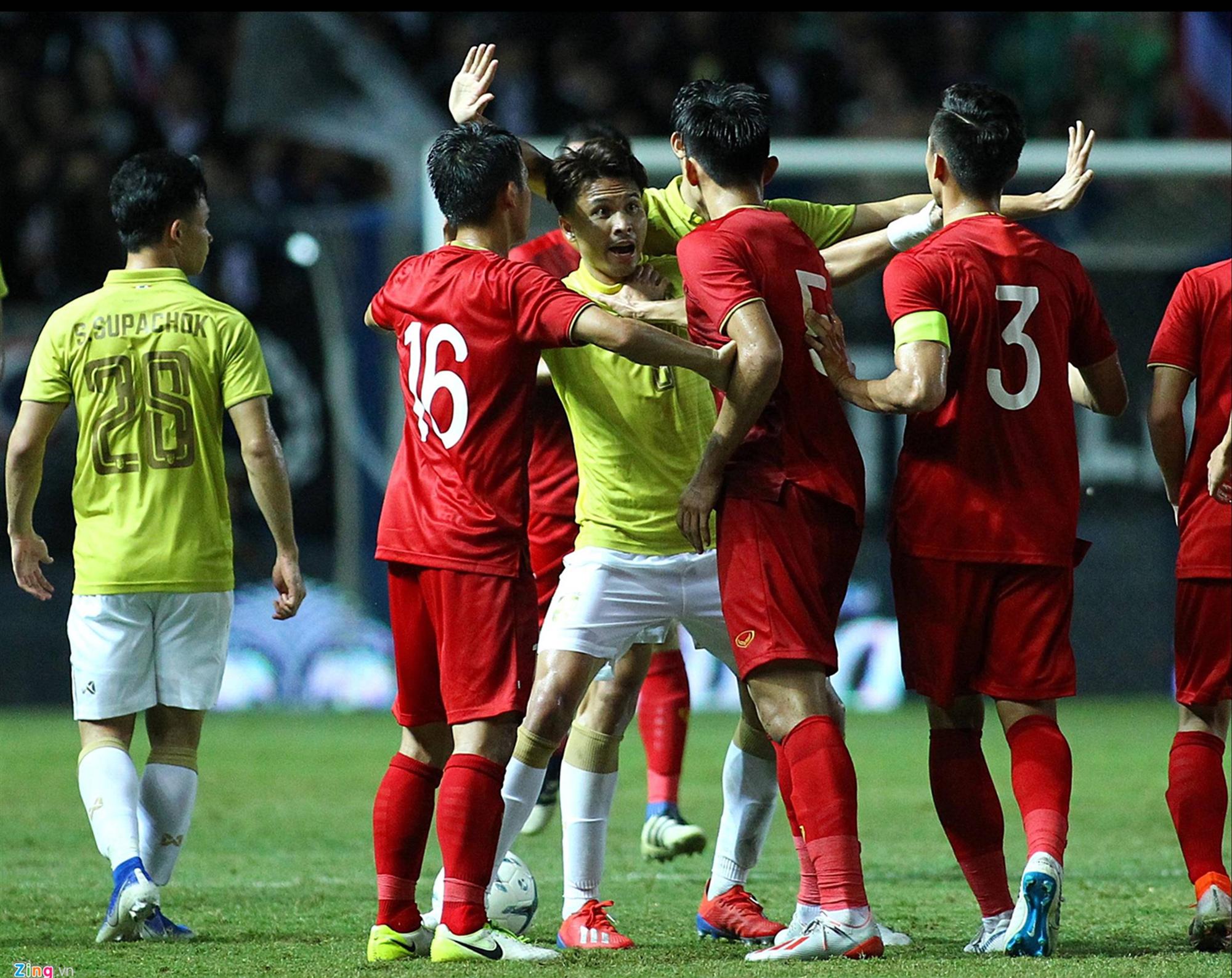 | Thái Lan và Việt Nam có một trận đấu căng thẳng với hàng loạt pha va chạm "nảy lửa" trên sân. Một trong những tình huống như thế khiến cầu thủ hai đội lao vào nhau. |