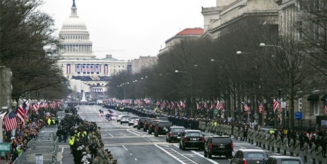 | Đoàn xe trong lễ nhậm chức của Tổng thống Donald Trump trên đại lộ Pennsylvania. Ảnh: AP. |