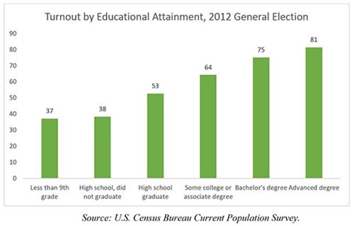Biểu đồ tỉ lệ bỏ phiếu năm 2012 cho thấy, người càng có học thức cao, càng đi bỏ phiếu đầy đủ |