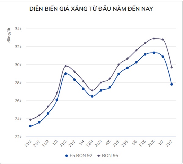 Từ 0h ngày 11/7, sau khi áp dụng giảm thêm thuế bảo vệ môi trường, giá xăng E5 RON 92 trong nước giảm 3.110 đồng/lít còn 27.780 đồng/lít và xăng RON 95 giảm 3.090 đồng/lít còn 29.670 đồng/lít.