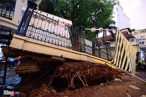 Gió giật tới cấp 9 làm bật gốc cây xà cừ trước cổng Bộ Y tế, làm bung cả móng phòng thường trực. Ảnh: Lê Hiếu. |
