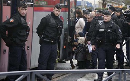 Lực lượng Hiến binh Pháp đứng bảo vệ trẻ em lên một xe buýt khi chúng được sơ tán khỏi hiện trường vụ hai bắt cóc con tin tại một khu công nghiệp ở Dammartin-en-Goële, phía đông bắc Paris ngày 9.1. |
