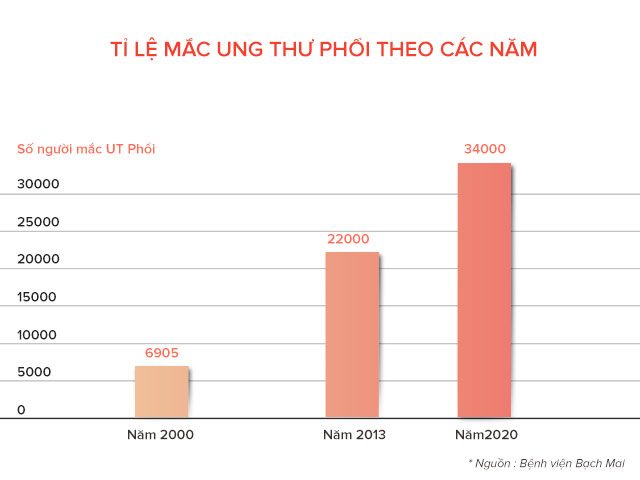 Mỗi năm Việt Nam có khoảng 22.000 ca mắc mới và hơn 19.500 ca tử vong do ung thư phổi. Các chuyên gia dự kiến, đến năm 2020, con số này có thể lên đến 34.000.