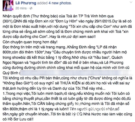 Mới đây, Lê Phương đã chia sẻ hình ảnh chụp lại "Đơn xin rút đơn khởi kiện" của Quách Ngọc Ngoan lên trên trang cá nhân của mình và nhận được nhiều chú ý.
