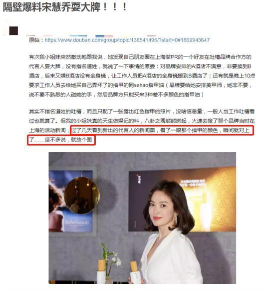 Đầu tiên, Song Hye Kyo tỏ ra không hài lòng với khách sạn do nhãn hàng sắp xếp và đòi đổi nơi ở. Sau đó, nữ diễn viên lại tiếp tục phàn nàn trong phòng khách sạn mới không có gương soi toàn thân, và yêu cầu nhân viên phải mang gương từ khách sạn cũ sang. Đến 10 giờ đêm, kiều nữ xứ Hàn lại yêu cầu nhân viên sự kiện phải ra ngoài mua đúng màu sơn móng tay mà chính cô đã làm hỏng. Ngoài ra, Song Hye Kyo còn từ chối làm việc với nhân viên làm nail do ban tổ chức sắp xếp, đơn giản chỉ vì không muốn người lạ chạm vào tay. Sự việc này đã khiến Song Hye Kyo bị "mất điểm" trong mắt nhiều cư dân mạng.