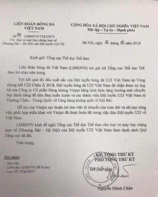 Theo đó, VFF đã gửi công văn lên Tổng cục TDTT về việc "hủy vé máy bay chặng lượt về (Thượng Hải – Hà Nội) của ĐT U23 Việt Nam" với lí do: "Với kết quả thi đấu xuất sắc của ĐT bóng đá U23 Việt Nam tại VCK U23 Châu Á 2018, ĐT bóng đá U23 Việt Nam đã nhận được sự ủng hộ của Công ty Cổ phần Hàng không Vietjet bằng hình thức tặng thưởng một chuyến bay dành riêng để đón Ban huấn luyện và các thành viên ĐT U23 Việt Nam từ Thường Châu – Trung Quốc về Cảng hàng không quốc tế Nội Bài.
