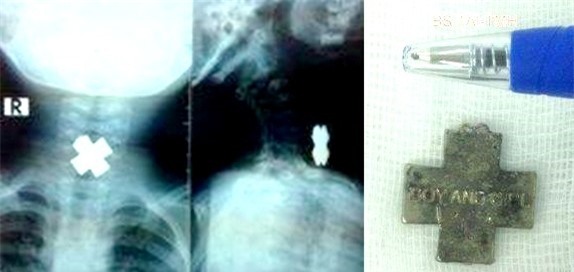Mặt dây chuyền hình chữ thập chắn ngang thực quản bệnh nhi. Ảnh: BV Nhi Đồng. |