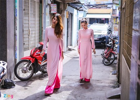 mặc áo dài may từ vải gấm màu kem, mái tóc chải chuốt cẩn thận. Theo