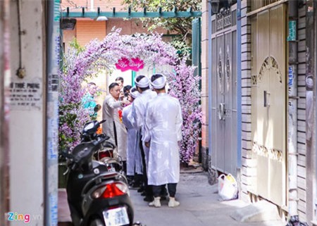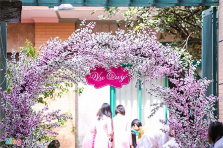 Cổng nhà gái được trang hoàng bởi vòng hoa màu hồng và trắng, các phụ dâu cũng chọn áo dài với tông màu nhẹ nhàng. |