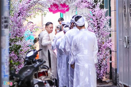 Vũ dẫn đầu đoàn nhà trai tiến vào gia đình cô dâu để làm lễ vu quy. Anh