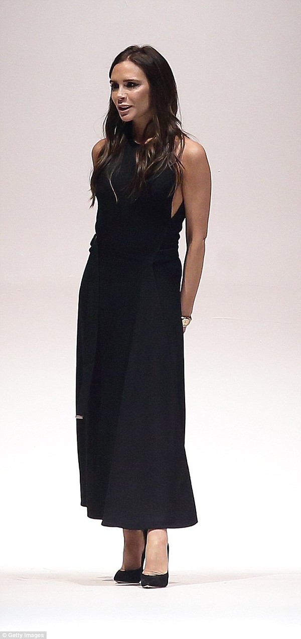 Như thường lệ, show diễn khép lại với hình ảnh bà Becks diện trang phục đơn giản mà thanh lịch, lênh khênh trên đôi giày cao gót ra chào khán giả.