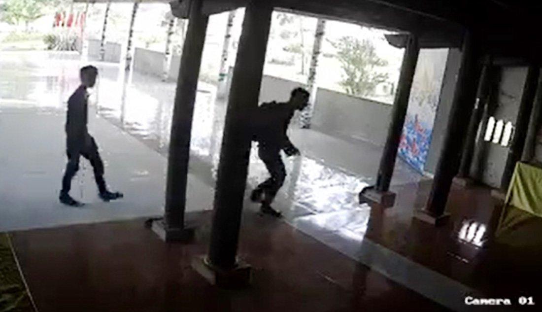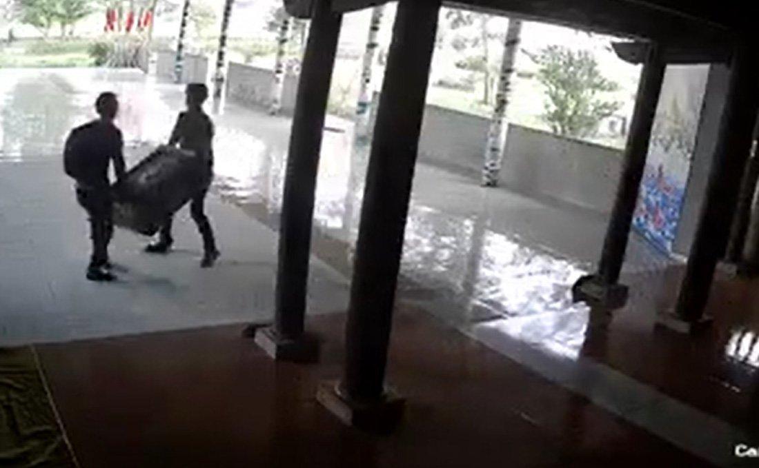 Camera ghi lại cảnh 2 thanh niên đột nhập vào chùa Hồng Phúc (huyện Nghi Lộc, Nghệ An) khiêng hòm công đức nhà chùa làm bằng két sắt ra ngoài lấy toàn bộ tài sản.