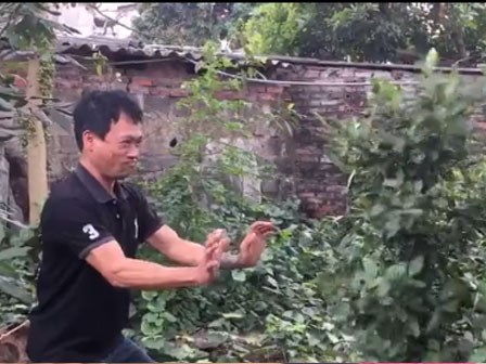 Người đàn ông tạo thế vận công khiến cho cành cây phía trước mặt rung rinh một cách dữ dội