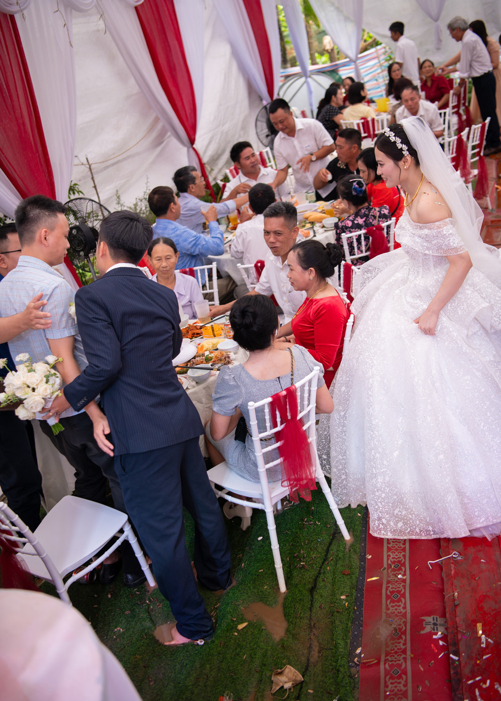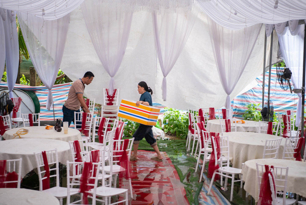Nhiều tấm gỗ được kê ngay tại lối ra vào để khách khứa di chuyển dễ hơn. Rạp cưới cũng được gia cố đề phòng dông lốc bất ngờ.