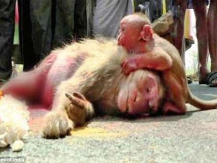 Tại miền Nam Ấn Độ, một đoạn video thương tâm ghi lại hình ảnh chú khỉ con đang khóc bên cạnh thi thể khỉ mẹ khiến nhiều người không khỏi xót xa. Một chiếc xe chạy với vận tốc khá nhanh đã tông vào con khỉ xấu số khi nó đang cố băng qua đường. Chú khỉ nhìn thấy mẹ mình bị thương liền chạy đến bên cạnh và ra sức đánh thức mẹ dậy.