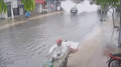 Khoảng 11h trưa cùng ngày, dù mưa đã ngớt nhưng nước ngập vẫn chưa rút, 1 chiếc ô tô màu đen bất ngờ lao nhanh qua đoạn đường ngập với tốc độ cao khiến nước văng tung tóe. Hình ảnh này được một camera gần đó ghi lại.