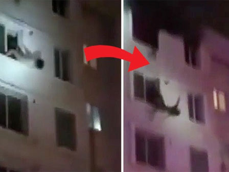 | Hai phụ nữ bị rơi khỏi cửa sổ tầng 6 tòa nhà cao tầng may mắn thoát chết nhờ được lính cứu hỏa giữ lại. Ảnh chụp màn hình. |
