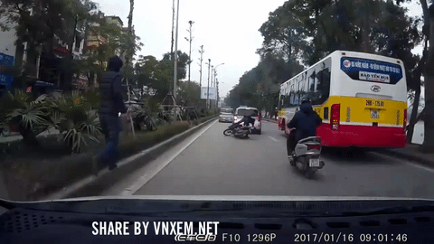 Ngay lập tức, người này dùng tay bám vào xe buýt, chân trượt theo xe vài bước mới dừng lại. Tại hiện trường, nhiều đồ đạc trong cốp xe Lead bật tung ra, người và xe nằm sõng soài giữa đường.