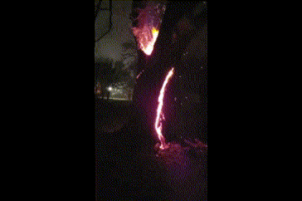 Đoạn video cho thấy một tia sét đánh trúng một cây lớn trong sân của một ngôi nhà. Tia sét đã gây ra một vụ nổ lớn phá hủy vài cành cây và tạo ra một tia lửa sáng chói khiến đất đá bắn tung lên.