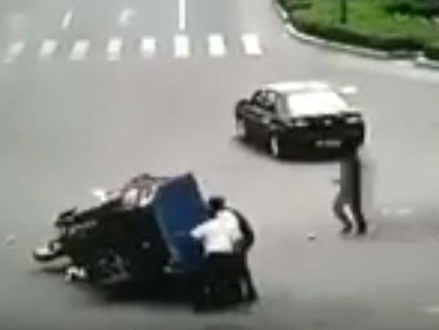 Người đàn ông Trung Quốc vừa vào chiếc xe con đỗ bên vệ đường thì liên tiếp hai chiếc bánh xe từ đâu lao tới làm nát đầu và kính chắn gió của xe.