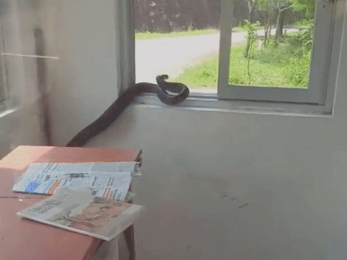 Kể cả khi bị một người đàn ông dùng chiếc gậy "uy hiếp" nhưng con rắn cũng không hề tỏ ra sợ hãi. Nó thậm chí còn trở nên giận dữ khi mọi người cố gắng đưa nó ra khởi chiếc xe máy.