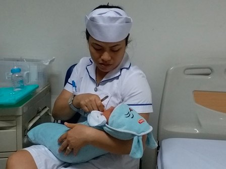 Bé trai bị mẹ bỏ lại khoảng 4 ngày tuổi, cân nặng 4,0kg hiện đang được các nhân viên Viện Huyết học Truyền máu Trung ương chăm sóc.