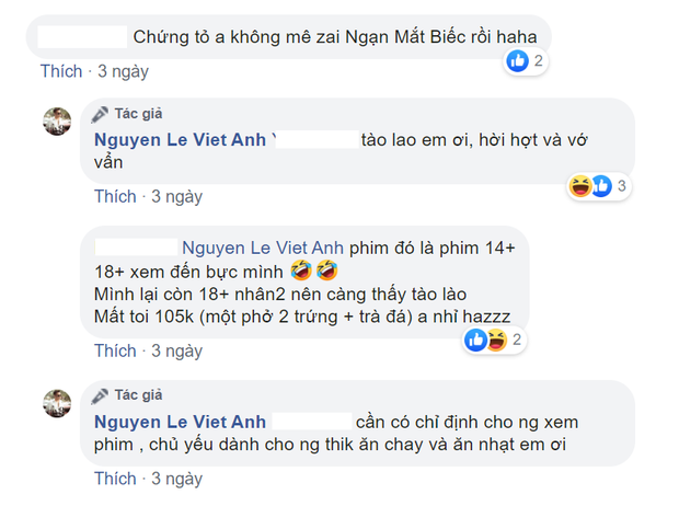 Đáng nói nhất là ngay dưới phần bình luận, Việt Anh còn nhấn mạnh chuyện Ngạn trong Mắt Biếc rất "hời hợt, vớ vẩn" và bộ phim chỉ dành cho "người thích ăn chay, ăn nhạt". Tuy vậy trong một bình luận khác, Việt Anh lại chia sẻ rằng mình chưa hề xem phim.