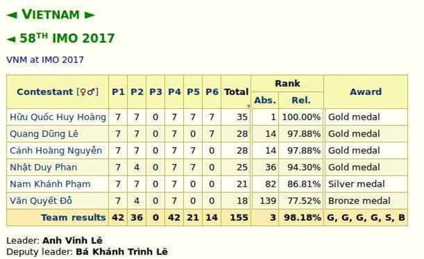 Trên trang cá nhân, PGS.TS Lê Anh Vinh - Trưởng đoàn Việt Nam - viết: 4 huy chương vàng (một huy chương vàng cao điểm nhất trong hơn 600 thí sinh), một huy chương bạc, một huy chương đồng, xếp thứ ba trên tổng số 112 nước tham dự IMO 2017. Các em đã đi vào lịch sử 43 năm tham dự IMO của Việt Nam! Cùng đứng thứ ba như năm 1999 và 2007 nhưng số huy chương vàng nhiều hơn.