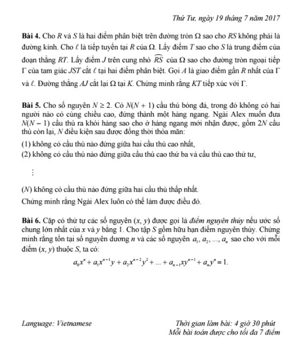 Sau khi kỳ thi kết thúc, thầy Nguyễn Khắc Minh đã chia sẻ đề thi IMO 2017 (phiên bản tiếng Anh và tiếng Việt) lên trang cá nhân.
