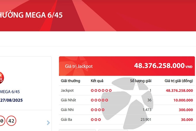 Công ty Xổ số Điện toán Việt Nam (Vietlott) thông tin, trong kỳ quay số mở thưởng lần thứ 1.236 của loại hình xổ số Power 6/55 diễn ra vào tối nay (30/8), hội đồng quay thưởng của Vietlott xác định giá trị giải thưởng độc đắc Jackpot 1 là 87.579.465.150 đồng (gần 87,6 tỷ đồng). Tuy nhiên, chưa có người chơi nào may mắn trúng giải độc đắc này.