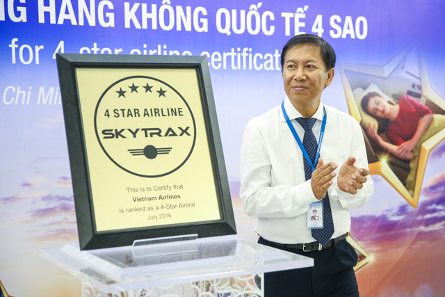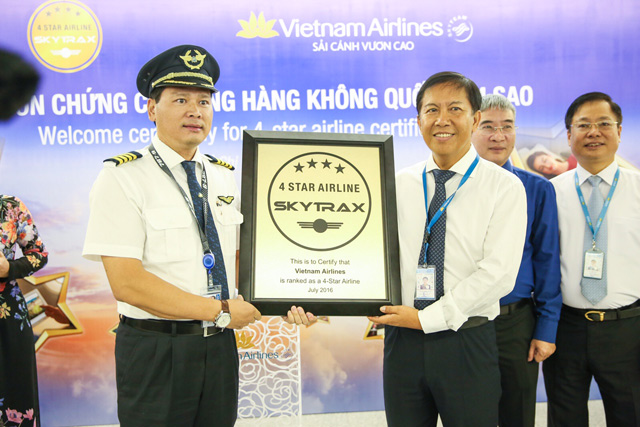Trước sự chứng kiến của 285 hành khách, Phó TGĐ Vietnam Airlines Phan Xuân Đức đã vinh dự nhận bàn giao chứng chỉ 4 sao của Skytrax từ phi hành đoàn.