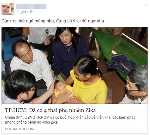 "Tối nay phải đi mua màn cho cả nhà nằm ngủ an toàn, tạm thời lánh nạn Zika cho chắc. Còn phải mua thêm màn cho ông bà khi tới chơi. Mấy lúc có dịch bệnh lại thấy thương mấy đứa nhỏ ghê gớm. Mọi người cũng nên ngủ mùng từ đây là vừa", một bà mẹ trẻ viết trên Facebook.