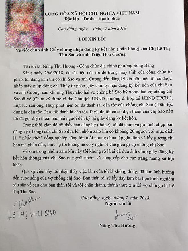 Theo đó, chị Nông Thu Hương – nữ công chức địa phương phường đứng ra nhận lỗi về sự việc, đồng thời viết lời xin lỗi theo yêu cầu của chị Thu Sao. Trong giấy xin lỗi, chị Hương kể lại toàn bộ sự việc: “Vào sáng 29/6, do tài liệu của tôi để trong máy tính của công chức tư pháp, tôi đang làm thì có chị Sao và anh Cương đến đăng ký kết hôn, tôi được nhập máy giúp đồng chí Thùy tư pháp giấy chứng nhận đăng ký kết hôn.