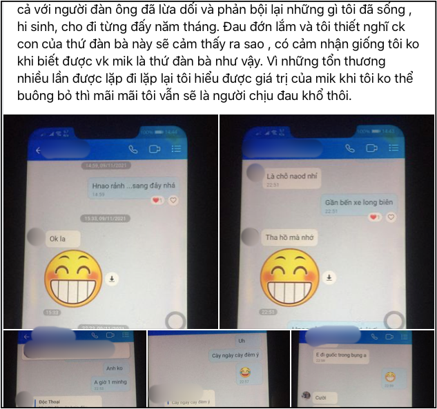 "Đến lần này, tôi phát hiện tin nhắn chúng nó gửi cho nhau thì không đủ bao dung nữa. Tôi muốn buông bỏ, chấm dứt tất cả với người đàn ông lừa dối, phản bội lại những gì tôi đã sống, hi sinh từng ấy năm.