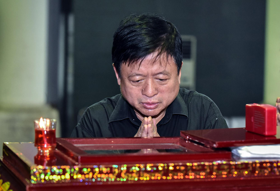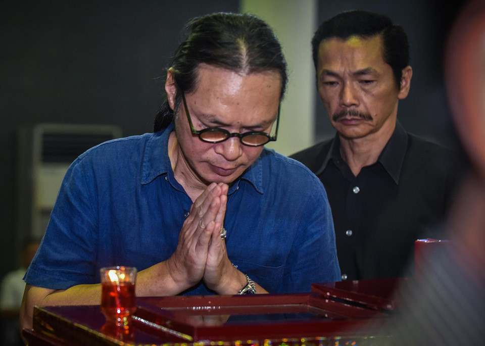 | Thứ trưởng Bộ Văn hóa Thể thao Du lịch, NSND Vương Duy Biên lặng người trước linh cữu nghệ sĩ Bùi Cường. |
