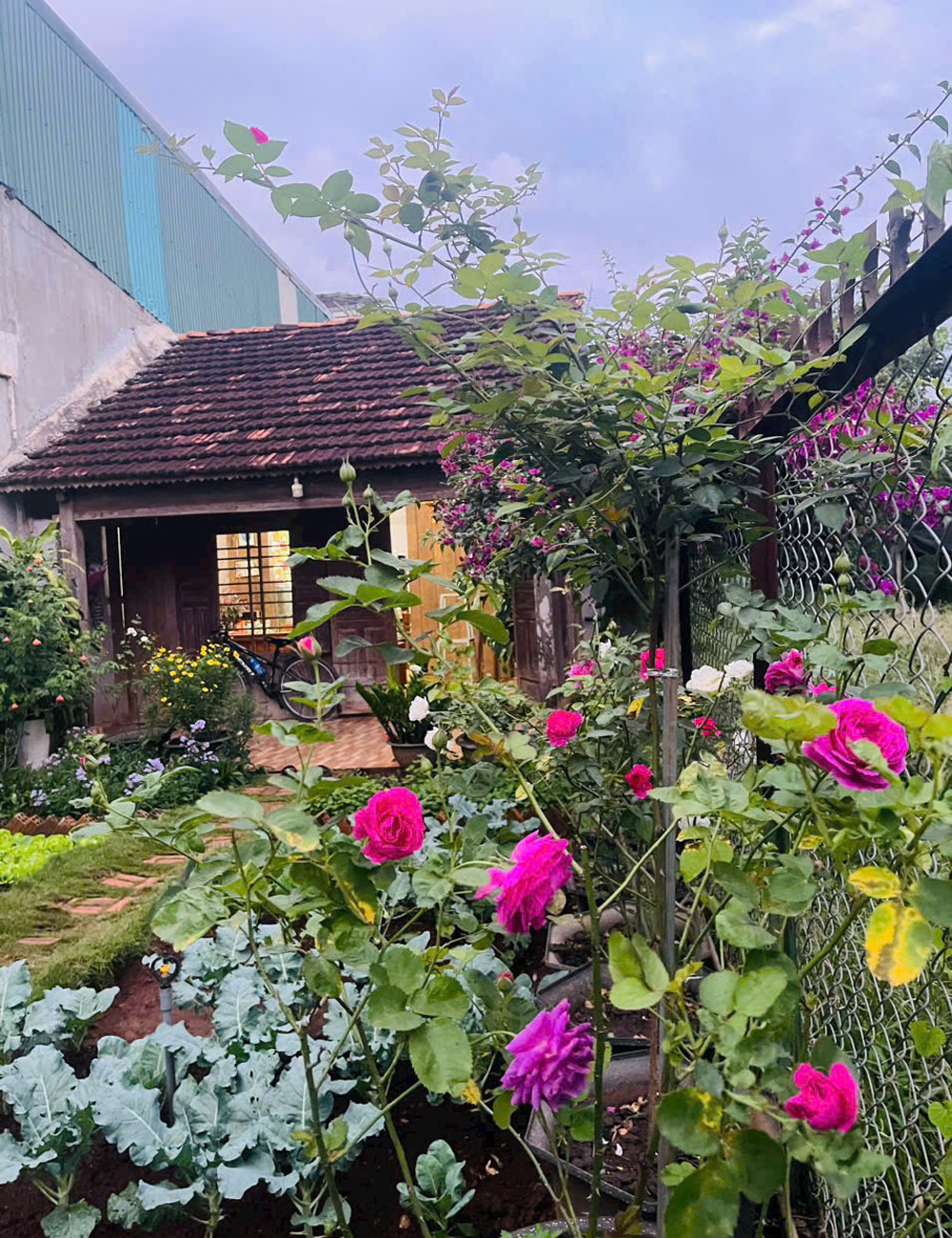 Đó là một căn nhà gỗ nhỏ, diện tích sinh hoạt khoảng 50m2, từ mái ngói đến lòng nhà đều đã nhuốm màu thời gian. Phía trước nhà là một khu vườn rộng khoảng 100m2 trồng hoa và các loại rau xanh cùng lối đi phủ cỏ.