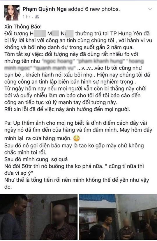 Theo Quỳnh Nga cho biết, người đàn ông này tên H.M.N, thường trú tại Hưng Yên và từng lập ra rất nhiều Facebook "ảo" để vu khống, chửi rủa vợ chồng cô cũng như bạn bè, khách hàng thân thiết.