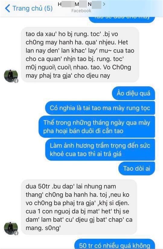 Tin nhắn H.M.N gửi cho vợ chồng Quỳnh Nga với mục đích tống tiền 50 triệu.