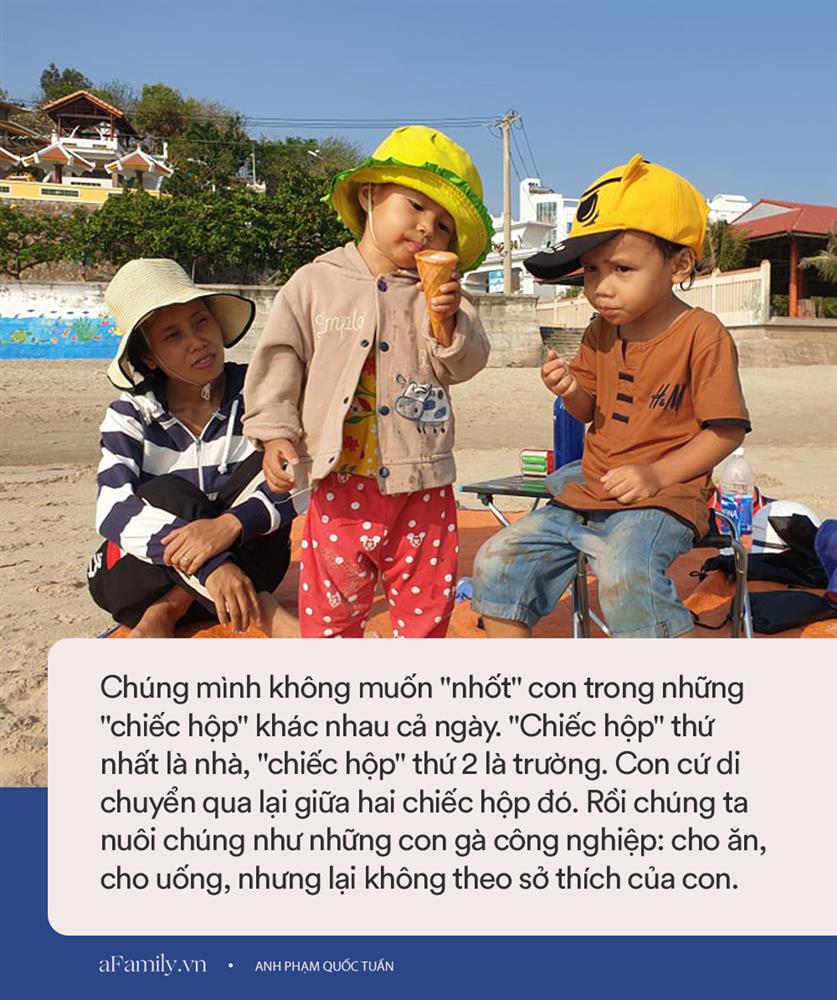 Chúng mình không muốn "nhốt" con trong những "chiếc hộp" khác nhau cả ngày. "Chiếc hộp" thứ nhất là nhà, "chiếc hộp" thứ 2 là trường. Con cứ di chuyển qua lại giữa hai chiếc hộp đó. Rồi chúng ta nuôi chúng như những con gà công nghiệp: cho ăn, cho uống, nhưng lại không theo sở thích của con.