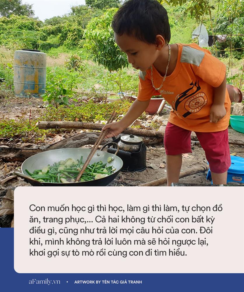 Tất cả những điều này đều được hình thành từ cách dạy con tự lập, tự định hướng ngay từ nhỏ của đôi vợ chồng 8x. "Giai đoạn con thông minh nhất là từ 0-6 tuổi. Vậy nên trong khoảng thời gian này, chúng mình hướng tới việc dạy con thật nhiều điều trên đời. Con muốn học gì thì học, làm gì thì làm, tự chọn đồ ăn, trang phục,... Cả hai không từ chối con bất kỳ điều gì, cũng như trả lời mọi câu hỏi của con. Đôi khi, mình không trả lời luôn mà sẽ hỏi ngược lại, khơi gợi sự tò mò rồi cùng con đi tìm hiểu.