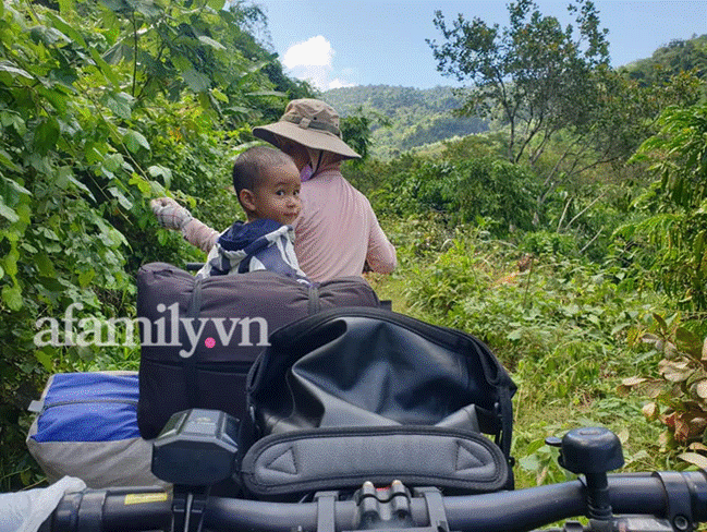 Gia đình anh Tuấn - chị Thúy đưa con đi phượt trên 2 chiếc xe đạp.