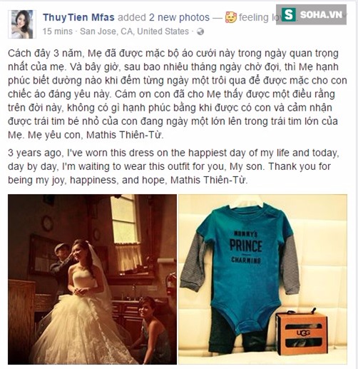 Cách đây 3 năm, Mẹ đã được mặc bộ áo cưới này trong ngày quan trọng nhất của mẹ. Và bây giờ, sau bao nhiêu tháng ngày chờ đợi, thì Mẹ hạnh phúc biết dường nào khi đếm từng ngày một trôi qua để được mặc cho con chiếc áo đáng yêu này. Cám ơn con đã cho Mẹ thấy được một điều rằng trên đời này, không có gì hạnh phúc bằng khi được có con và cảm nhận được trái tim bé nhỏ của con đang ngày một lớn lên trong trái tim lớn của Mẹ. Mẹ yêu con, Mathis Thiên-Từ.